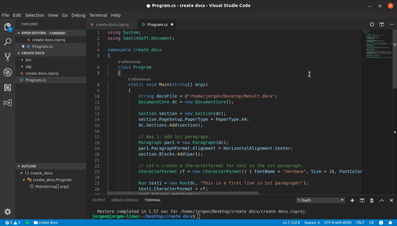 }Launch our application to create a new DOCX document, type the command: dotnet run
