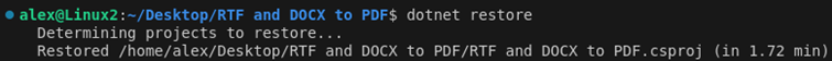 At once as we’ve added the package reference, we have to save the “RTF and DOCX to PDF.csproj” and restore the added package.