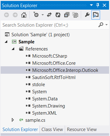Further, please unpack the archive. We’ll need the file “SautinSoft.RtfToHtml.dll” from the package. Create a new C# Console Application named RtfToHtmlEmail. Next add references to the “SautinSoft.RtfToHtml.dll”, “Microsoft Outlook Library” and “Microsoft.CSharp” as shown on pictures below: